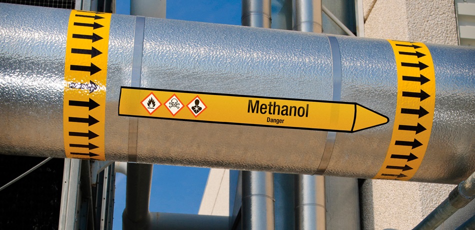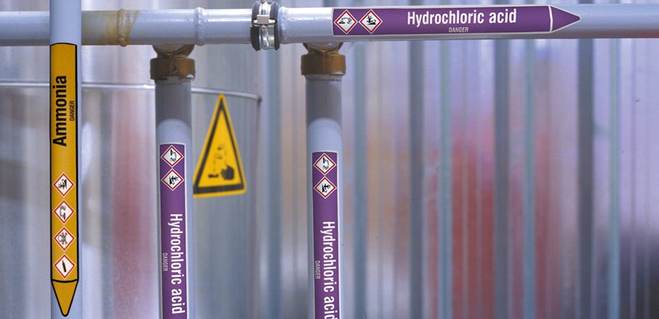 - Display of: substance name, flow direction, hazard symbol and in the correct colour of the medium.